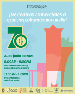 San Juan, Puerto Rico – 17 de junio de 2025 – El Instituto de Cultura Puertorriqueña (ICP) comenzará la celebración de su 70 aniversario este próximo sábado, 21 de junio, con una vibrante propuesta cultural que transformará seis centros comerciales alrededor de Puerto Rico en espacios culturales. Como parte de esta celebración, se presentará una variada programación artística y cultural, abierta al público y completamente gratuita, con el fin de acercar el arte y la cultura a todos los sectores de la población.